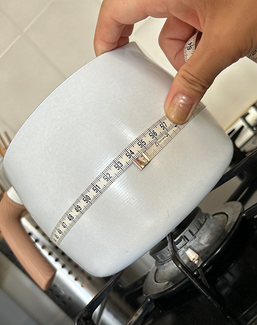 直径14cmとのことですが、よくよく見ると、鍋の口は14cmだけれど、丸くふっくらしたシルエット。一番太い部分は16cmはあるな。
