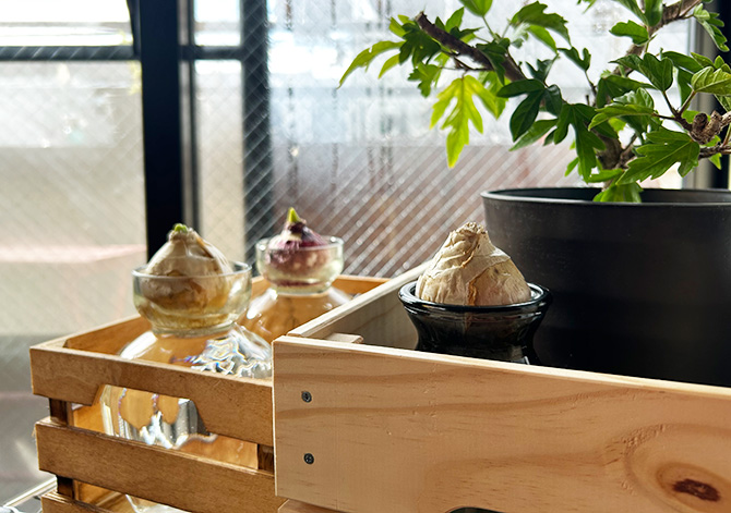 毎年恒例となっている、ヒヤシンス水栽培。スタートしました!
